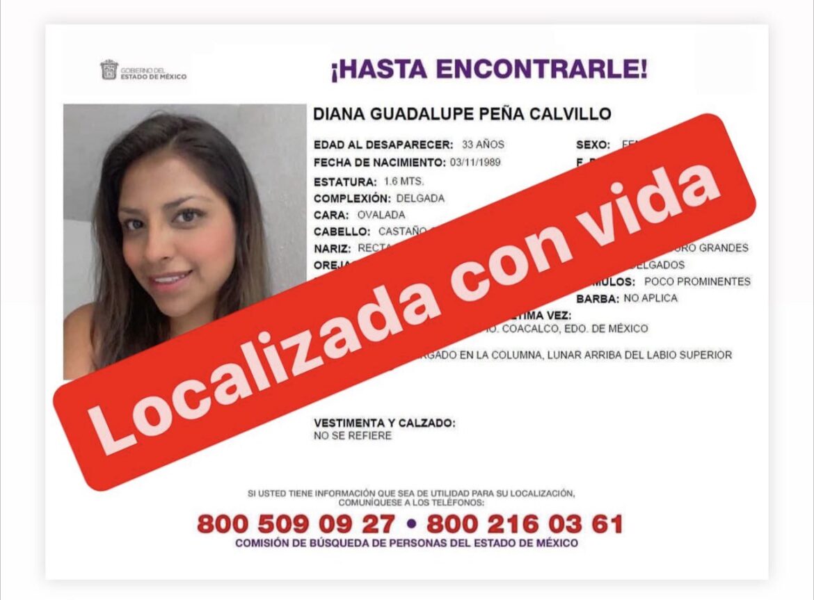 Así mismo, el auto de Diana, en el que días antes se trasladaba, fue localizado en la autopista Chamapa-La Venta, Estado de México.