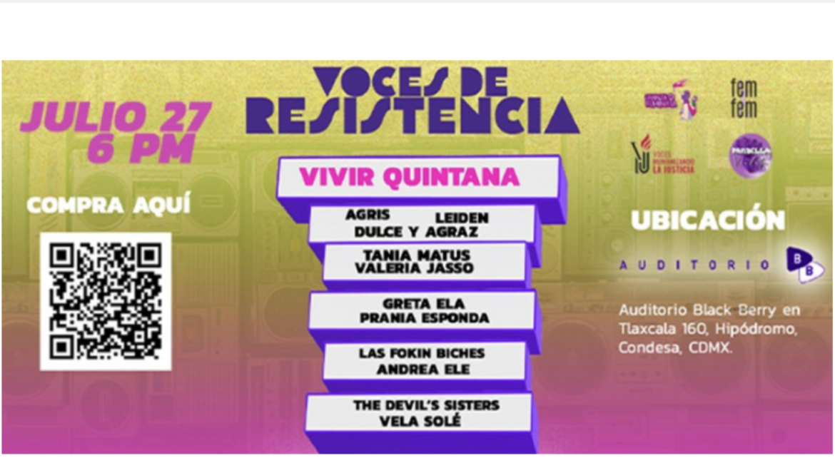 VOCES EN RESISTENCIA, tendrá lugar el sábado 27 de julio del 2024 a partir de las 19:00 horas en el Auditorio BB, ubicado en Tlaxcala 160, Col. Hipódromo – Condesa, en la Alcaldía Cuauhtémoc de la CDMX.
