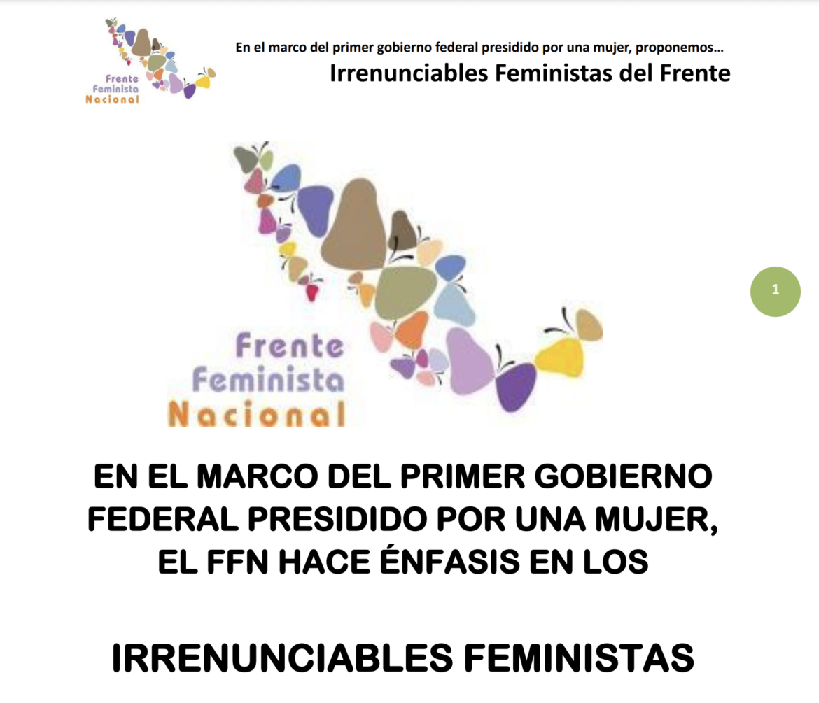 Por un lado, encontramos congresos paritarios en las ciudades capitales, mientras que en localidades apartadas —generalmente indígenas—, miles de mujeres aun no son libres para la elección de sus representantes, sea por la utilización de programas sociales, como forma de condicionar el voto, o la coacción, mecanismos que siguen utilizando los partidos políticos para asegurar los votos”. Por ello, el FFN consideró que es indispensable que el “Plan Nacional de Desarrollo y los planes sectoriales se hagan con una visión feminista para que el desarrollo económico y social prevea beneficiar a mujeres y hombres, reconociendo las desventajas, desigualdades y violencias reales que viven las mujeres en pleno siglo XXI”. Pidió a la gobernante establecer un diálogo constructivo y con todas las mujeres que requieren ser escuchadas y atendidas —sin importar el color del partido en el gobierno—, entre estas: las académicas, sindicalistas, trabajadoras, maestras, madres buscadoras, integrantes de organizaciones y periodista. A su vez, Olimpia Jaimes López, también integrante de la coordinación del FFN, explicó que “Los Irrenunciables Feministas…” conjuntan las aspiraciones de mujeres de 18 entidades federativas.