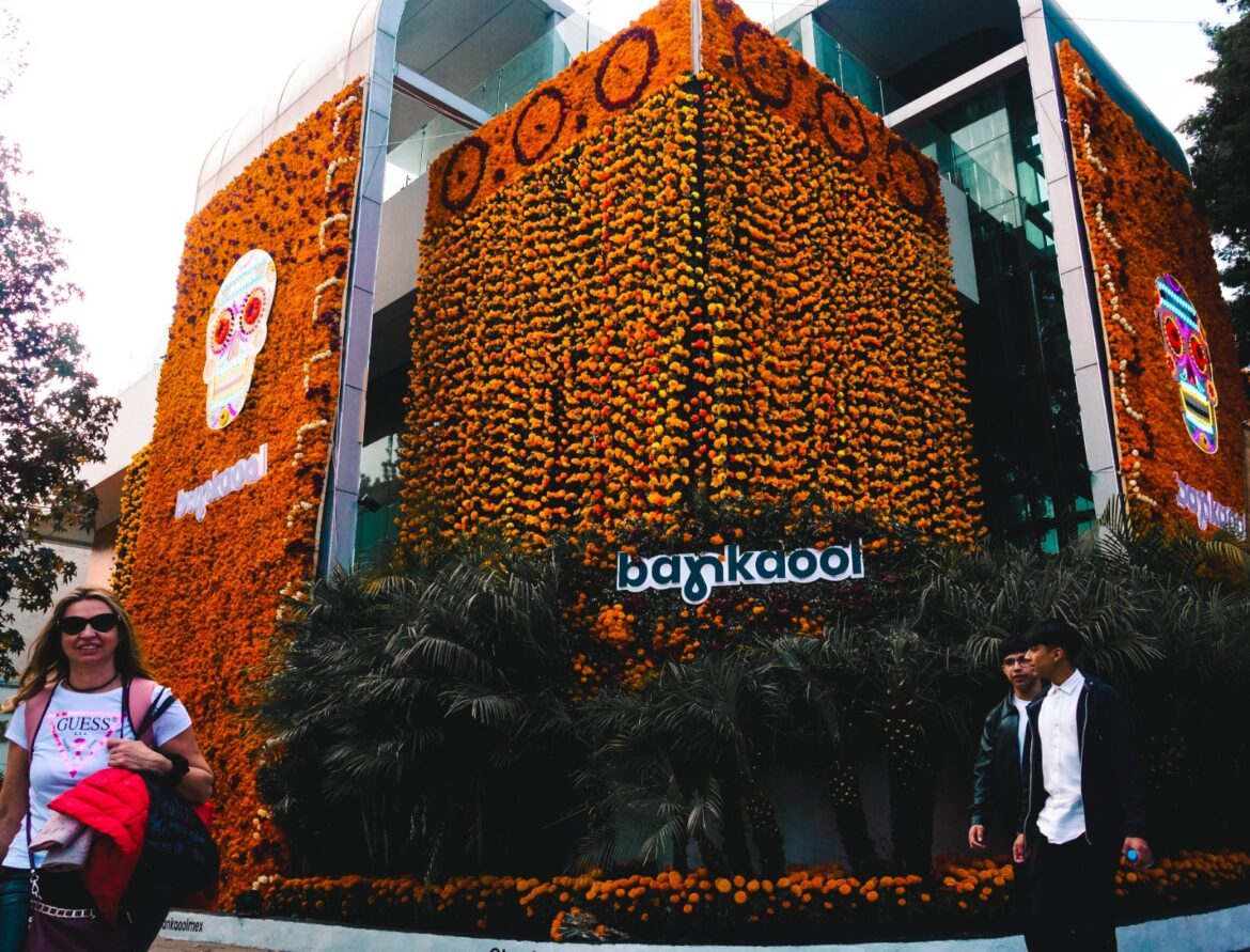 Llama la atención que una institución financiera como Bankaool, un banco chihuahuense que se empieza a expandir se tome tan enserio la celebración de muertos con una impresionante instalación color naranja, adornada con flores de cempasúchil en plena Avenida Presidente Masaryk. ¡No te la pierdas y aprovecha para tomarte una foto para el recuerdo, tienes hasta el 3 de noviembre!