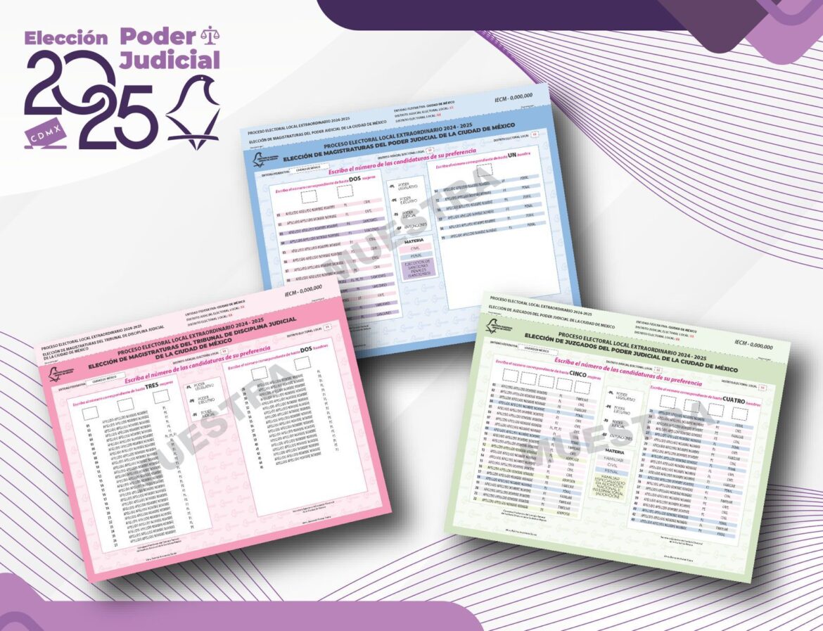 El próximo 1 de junio la ciudadanía de la capital del país recibirá 3 boletas diseñadas en colores diferentes para facilitar la identificación de los cargos a los que pertenecen: la rosa será para votar por quienes integrarán el Tribunal de Disciplina Judicial; la azul para magistraturas y la verde para juezas y jueces del Poder Judicial de la Ciudad de México.