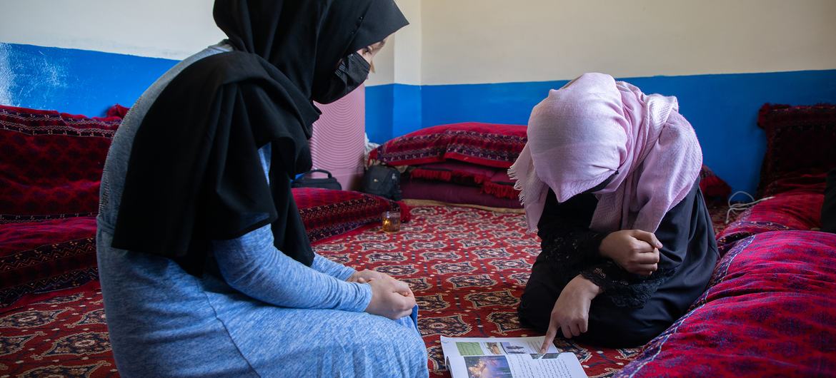 Foto de UNICEF/Amin Meerzad: Una mujer afgana ayuda a su hermana pequeña a estudiar en su casa.